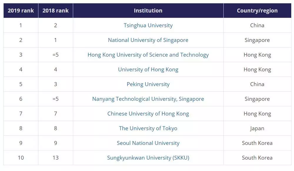 Nový žebříček je důkazem toho, že Čína posiluje svou pozici jednoho z globálních lídrů na poli výzkumu a vývoje. Tsinghua University, která se umístila jako první v celém žebříčku, poprvé přeskočila singapurskou National University of Singapore. Ta vévodila regionu od roku 2016 (na výsledky žebříčku z minulého roku se podívejte zde). Tsinghua University, někdy přezdívaná jako čínská MIT, posílila zejména v oblasti kvality vyučujících, v citačním impaktu a počtu zahraničních studentů. Kromě ní se v první desítce umístila ještě Peking University. Ta se ale od minulého roku propadla. Z třetí příčky se letos dostala až na pátou.