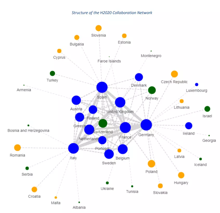 Jen do posledního rámcového programu Horizont 2020 se zapojilo 149 států ve více než 7 500 projektech, na kterých spolupracuje více stran. Na těchto projektech se podílelo 23 664 účastníků. Od FP 6 vygenerovaly rámcové programy 5 milionů spoluprací. Jádro sítě spolupráce v rámcových programech tvoří především státy EU-15. Klíčovými účastníky v posledním rámcovém programu pak jsou největší státy unie jako Německo, Francie, Velká Británie, Itálie a Španělsko. Největším a nejvýznamnějším participantem v síti je Německo, Velká Británie klesla v posledním rámcovém programu až na 4. místo. Česká republika je společně s Polskem nejblíže centru sítě mezi státy EU-13. Při zohlednění velikosti zemí je ale pořadí důležitosti jednotlivých účastníků z hlediska spolupráce zcela odlišné. Před Českou republikou je 20 členů EU a Polsko doplňuje Rumunsko na chvostu tabulky. Naopak do popředí se dostalo Finsko, Slovinsko a Lucembursko.