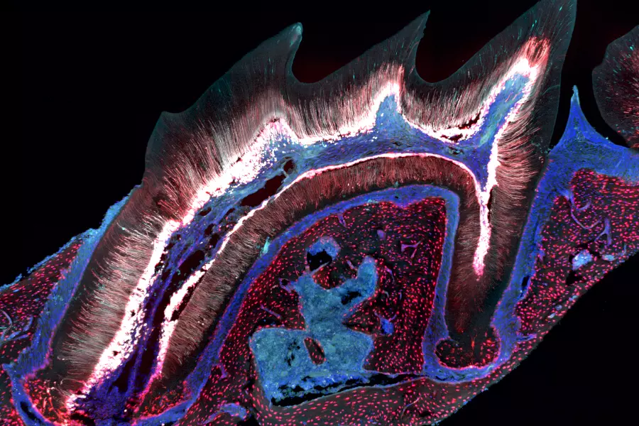 Řez myší stoličkou. Snímek zobrazující detailní vnitřní stavbu myší stoličky. Tento histologický řez detailně zobrazuje vláknitou mikrostrukturu dentinových tubulů a dalších mikroskopických prvků zubů. Snímky jako tento, jsou klíčové pro pochopení vývoje zubů a k výzkumu funkcí jejich jednotlivých součástí. Zdroj: CEITEC