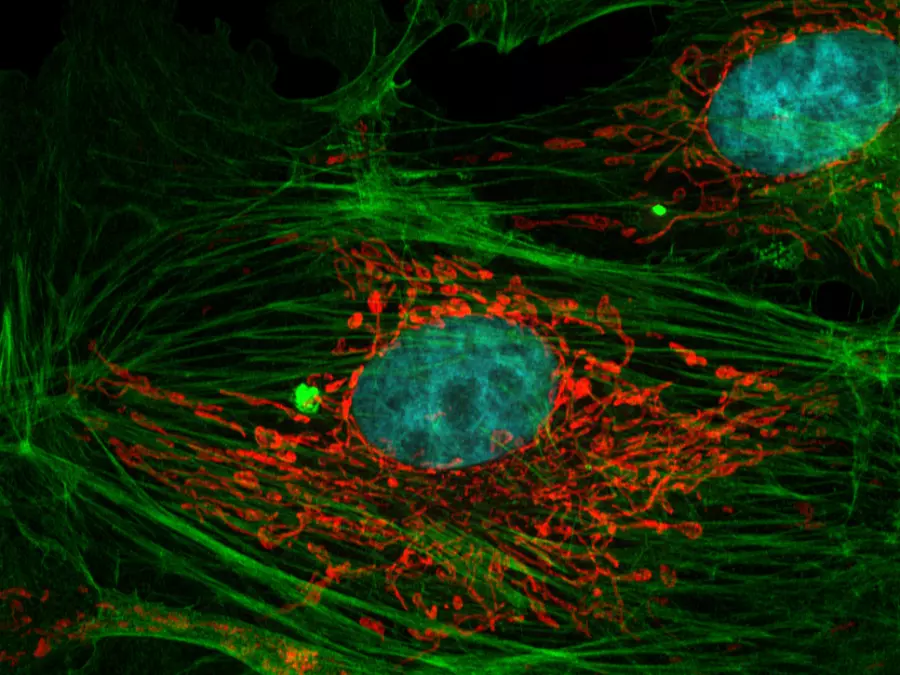 Buněčná továrna na energii. Mitochondrie jsou buněčné organely, kde probíhá Krebsův neboli citrátový cyklus, během kterého vzniká adenosintrifosfát – ATP. ATP pak buňka používá jako zdroj energie pro buněčné procesy. Mitochondrie jsou značeny červeně, aktinová filamenta jsou zelená a buněčné jádro svítí modře. Zdroj: CEITEC