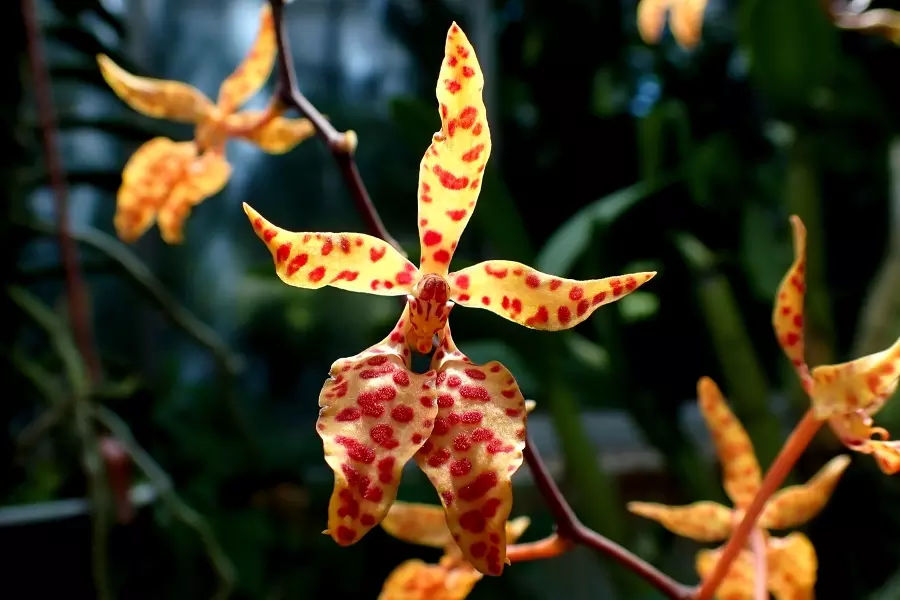 Květ orchideje Renanthera monachica jako by toužil po objemutí.