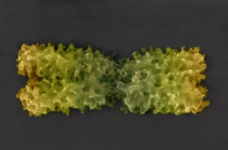 Kolorovaný snímek chromozomu v nativním stavu získaný pomocí nově vyvinuté pokročilé environmentální rastrovací elektronové mikroskopie, zdroj: ÚPT AV ČR. Na publikaci se podíleli autoři: Vilém Neděla, Eva Tihlaříková, Petr Cápal a Jaroslav Doležel.
